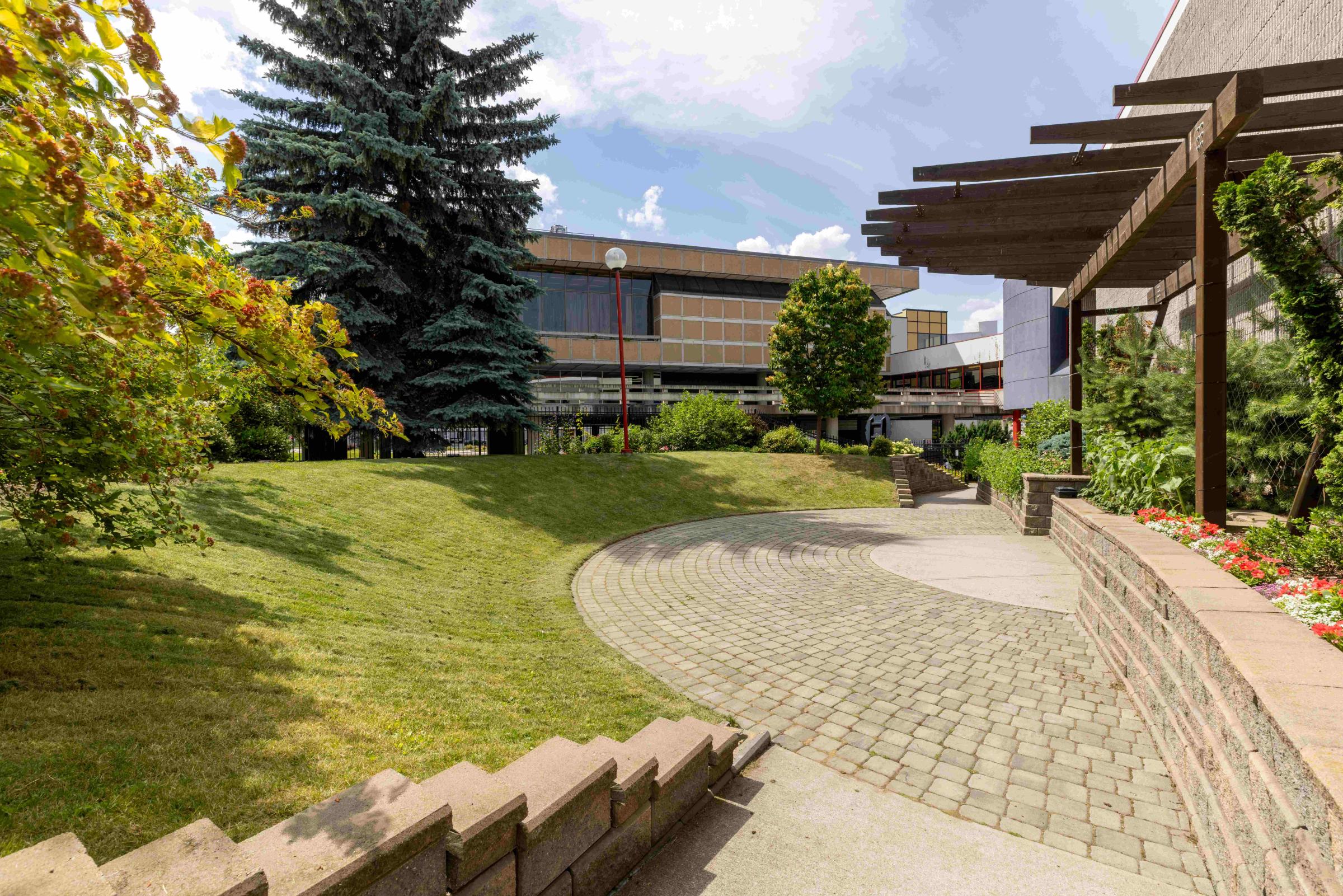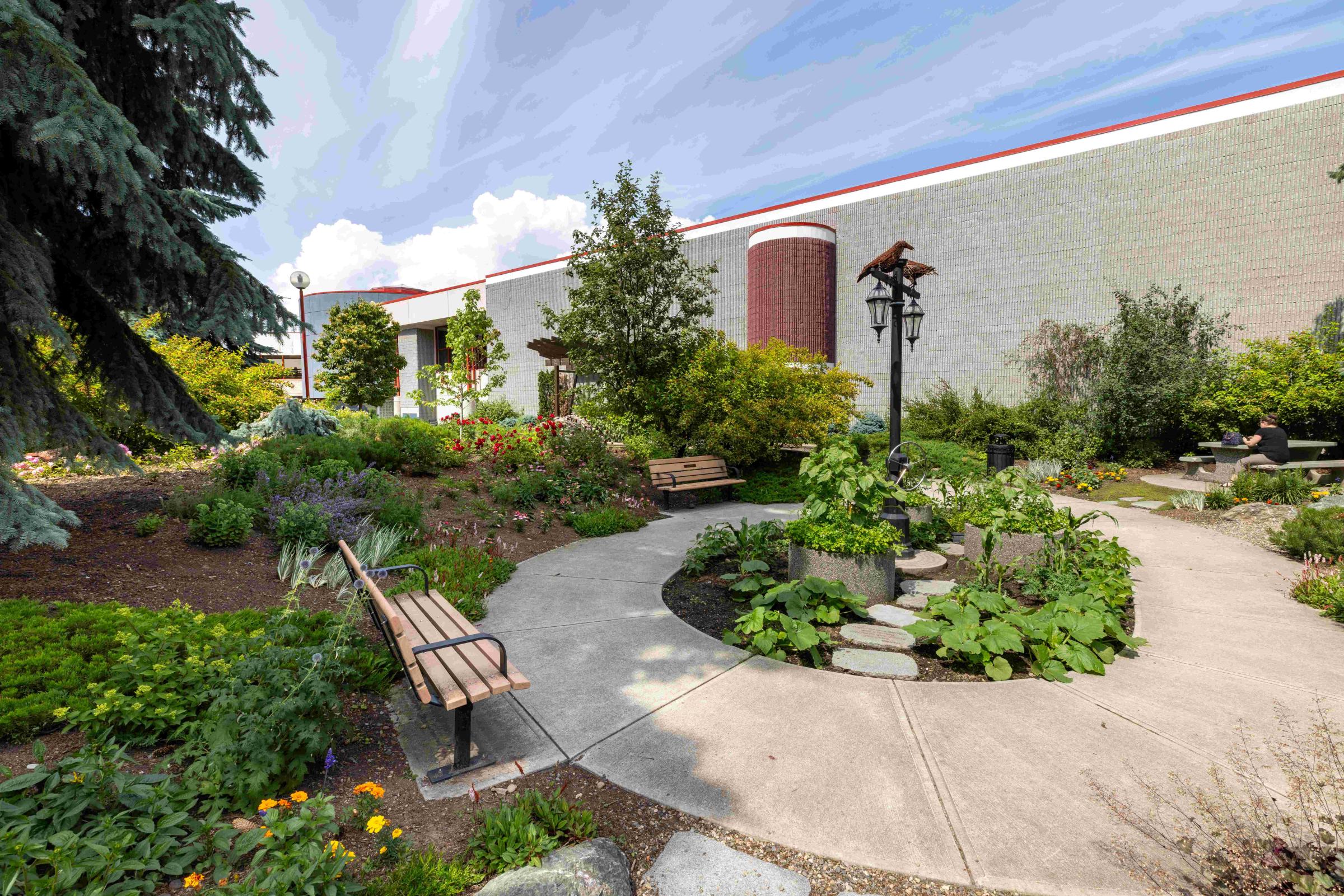 Efforts have been made to create a green space using regionally domestic plants, trees and flowers, including species that have been indicated for traditional use by local First Nations. The garden space has WiFi access.