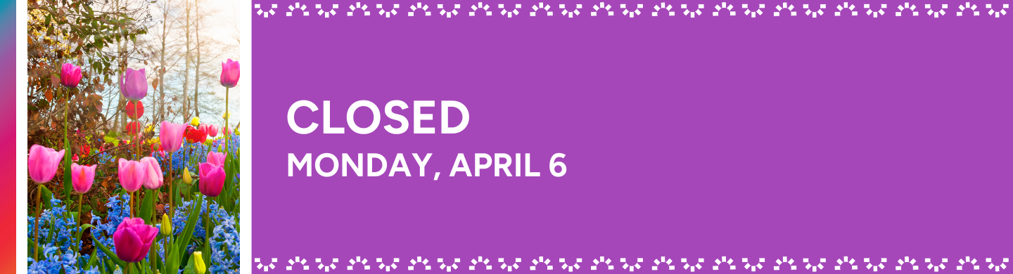Both branches of PGPL will be CLOSED Friday, April 3rd for Good Friday, Sunday April 5th and Monday April 6th for Easter. We will be open with regular hours (10am - 5pm) on Saturday, April 4th.